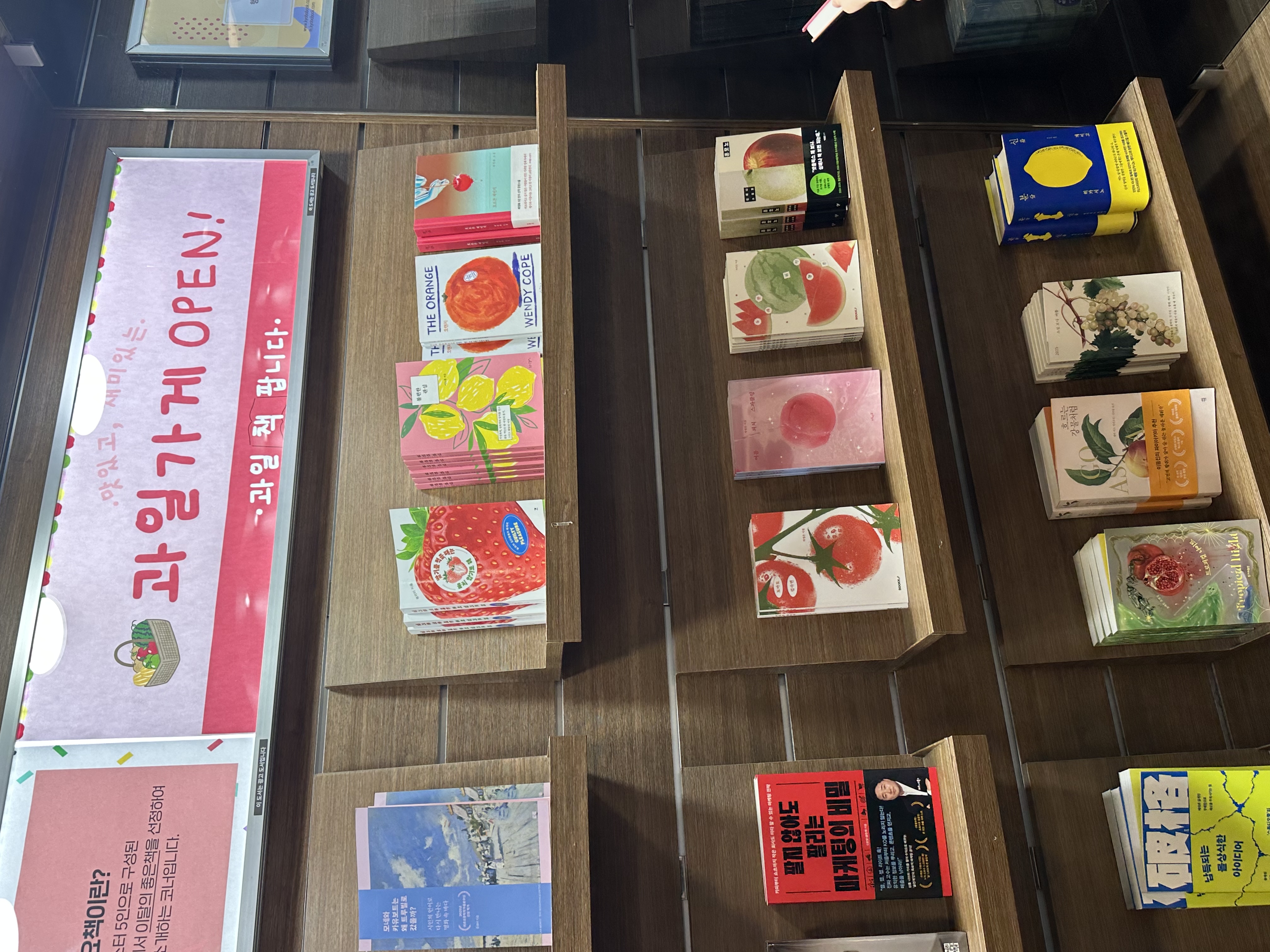 슬쩍 훑어본 시·에세이 순위 매대에 <토마토 컵라면>이 보이지 않아 살짝,, 아쉬워하며 약속 장소로 발걸음을 돌리던 순간! 발견한 <과일가게 OPEN>이벤트!
